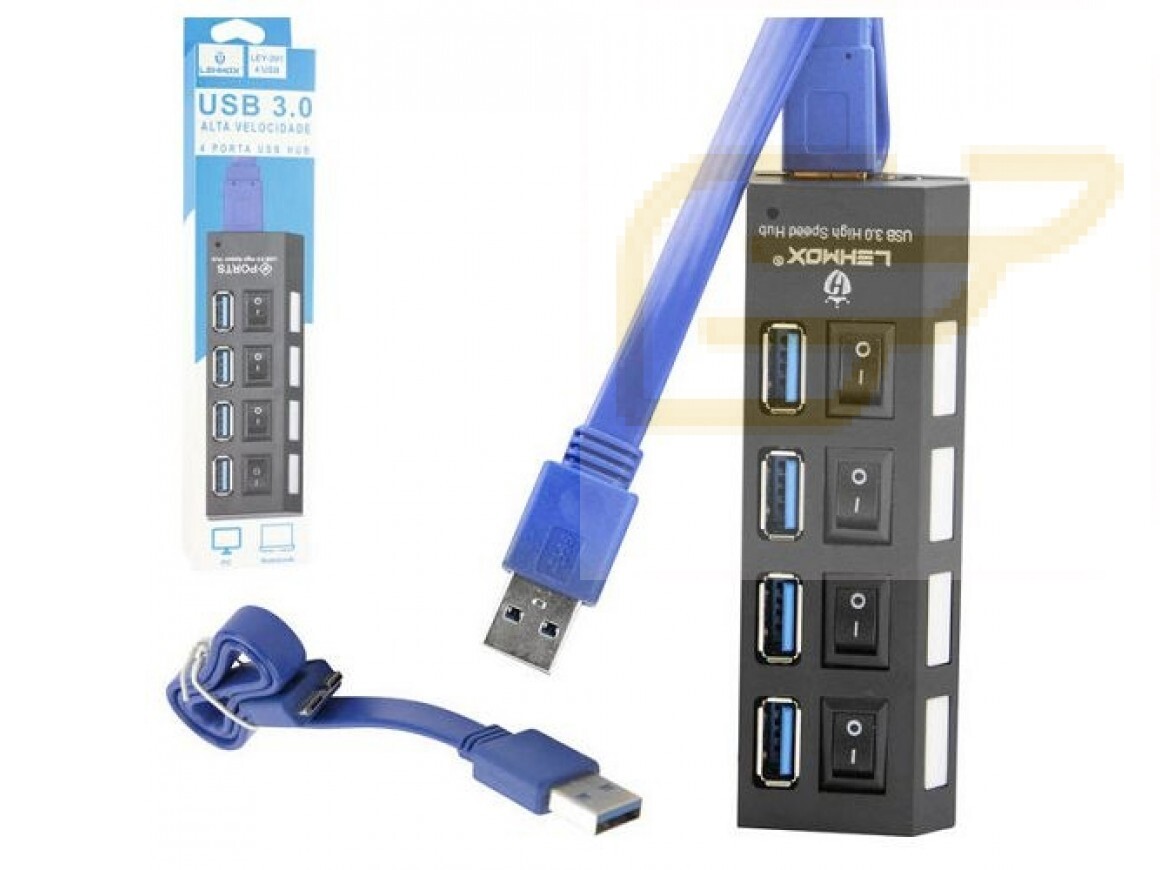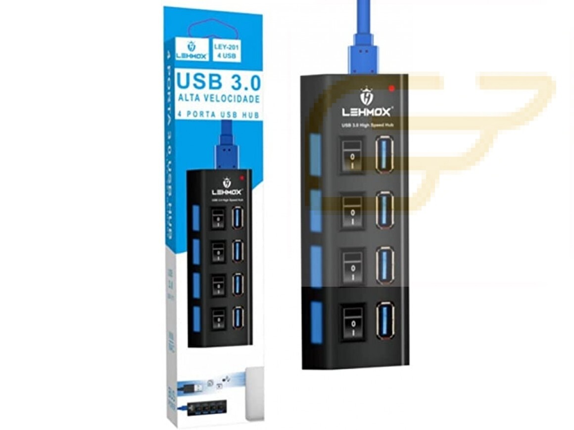Hub 3.0 4 Portas USB Extensor com Interruptor Lehmox - LEY-201 O hub transforma uma entrada em quatro, permitindo conectar vários dispositivos, como teclado, mouse, fone de ouvido, caixa de som, pendrive, celular, impressora e etc.