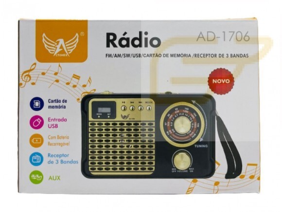Marca: Altomex Modelo: A-1705TA caixa de som Altomex A-1706 oferece um som natural com grande clareza e precisão, disperso uniformemente pela sala. Uma caixa de som que garante potência e qualidade igualmente na reprodução de conteúdo multimídia. Bluetooth Entrada USB (Pen drive) Recepção FM/AM/SW Cartão SD Entrada Auxiliar P2Bateria interna recarregável funciona direto na tomada Alça para transporte com lanterna
