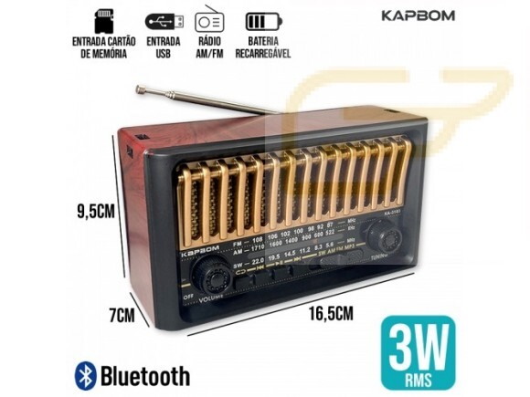 O caixa de som retrô vem com: AM/FM/SW, entrada para cartão de memória, entrada USB (pen drive) e Bluetooth.
