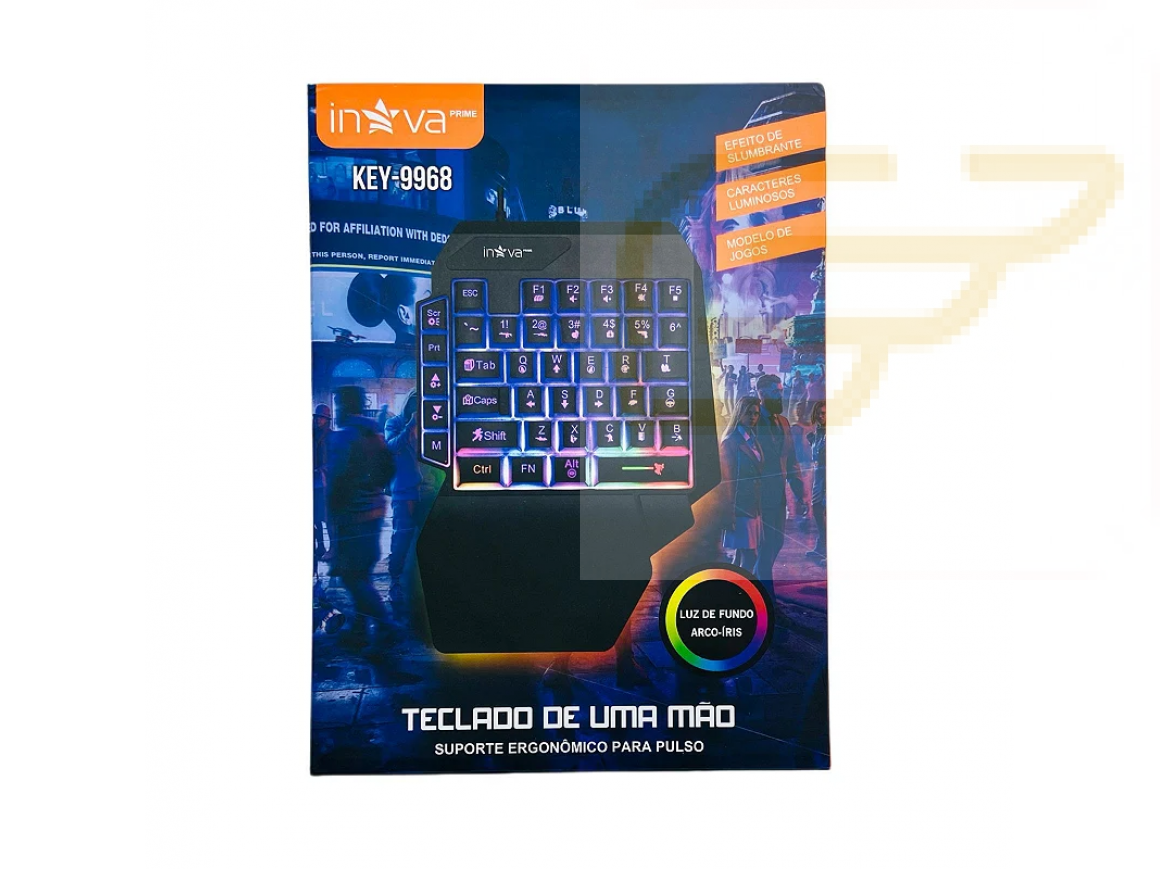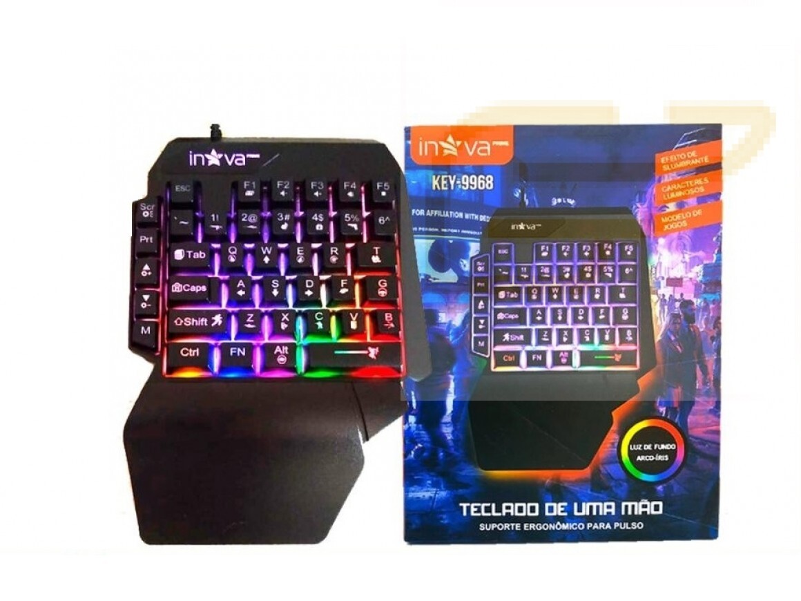 Teclado de uma mão ideal para jogos com suporte ergonômico para o pulso. Efeito deslumbrante com caracteres luminosos.