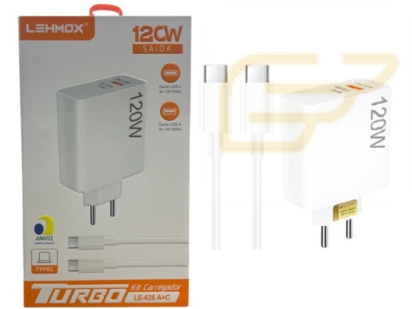 CARREGADOR TURBO 120W USB COM CABO TIPO C LEHMOX LE-626 A+C