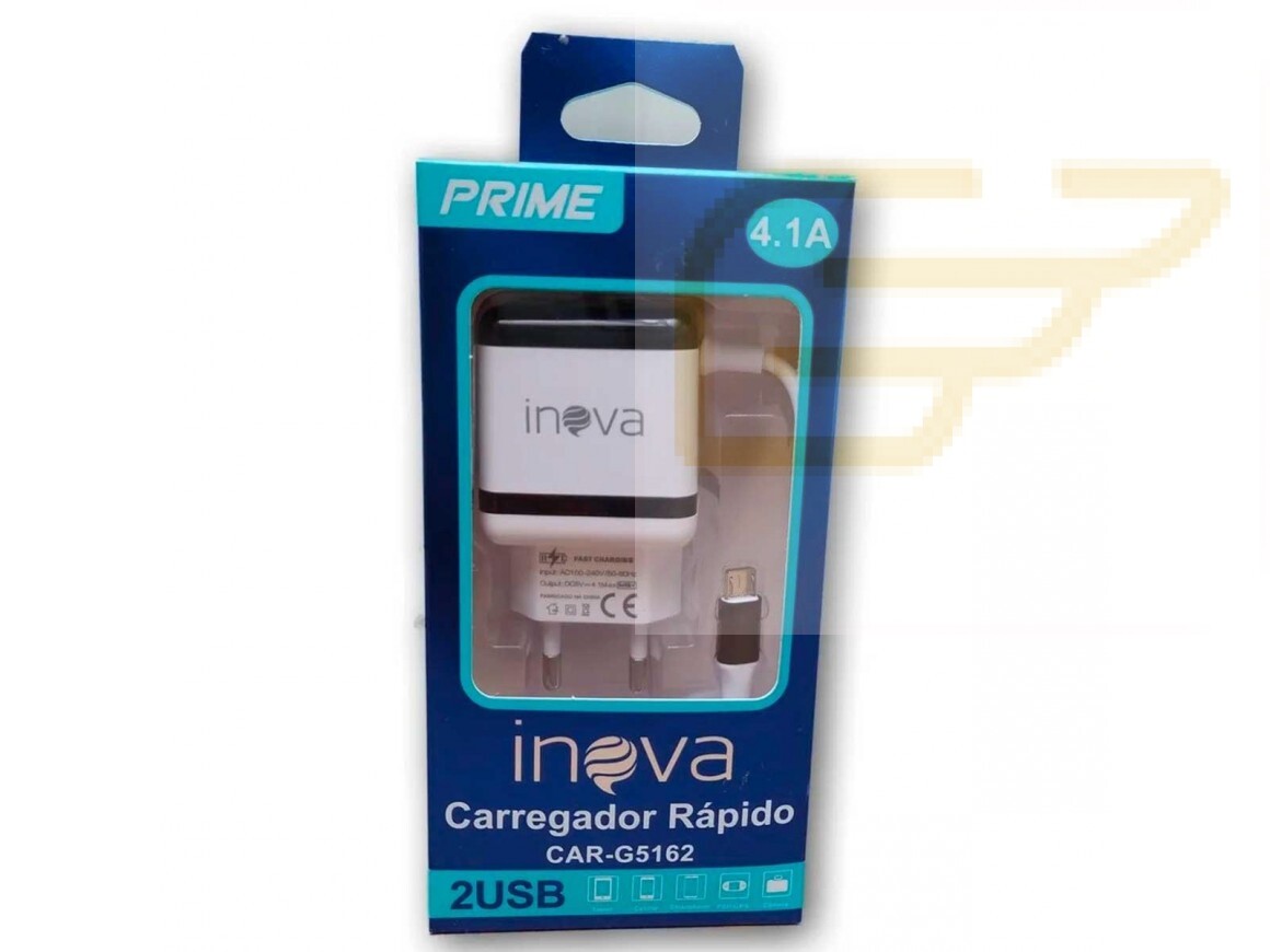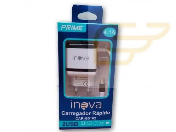 Fabricante: Inova Modelo: CAR-G5162 Entrada: 100-240V 50-60Hz (Bivolt) Saída: 5V 4.1A Cabo de 1 Metro Micro Usb V8 Porta Usb: 02 Fêmeas do Tipo A Incluso na Embalagem: 1x Carregador