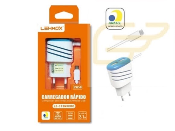 CARREGADOR RAPIDO MICRO 2USB 3.1A LEHMOX LE-513MICRO