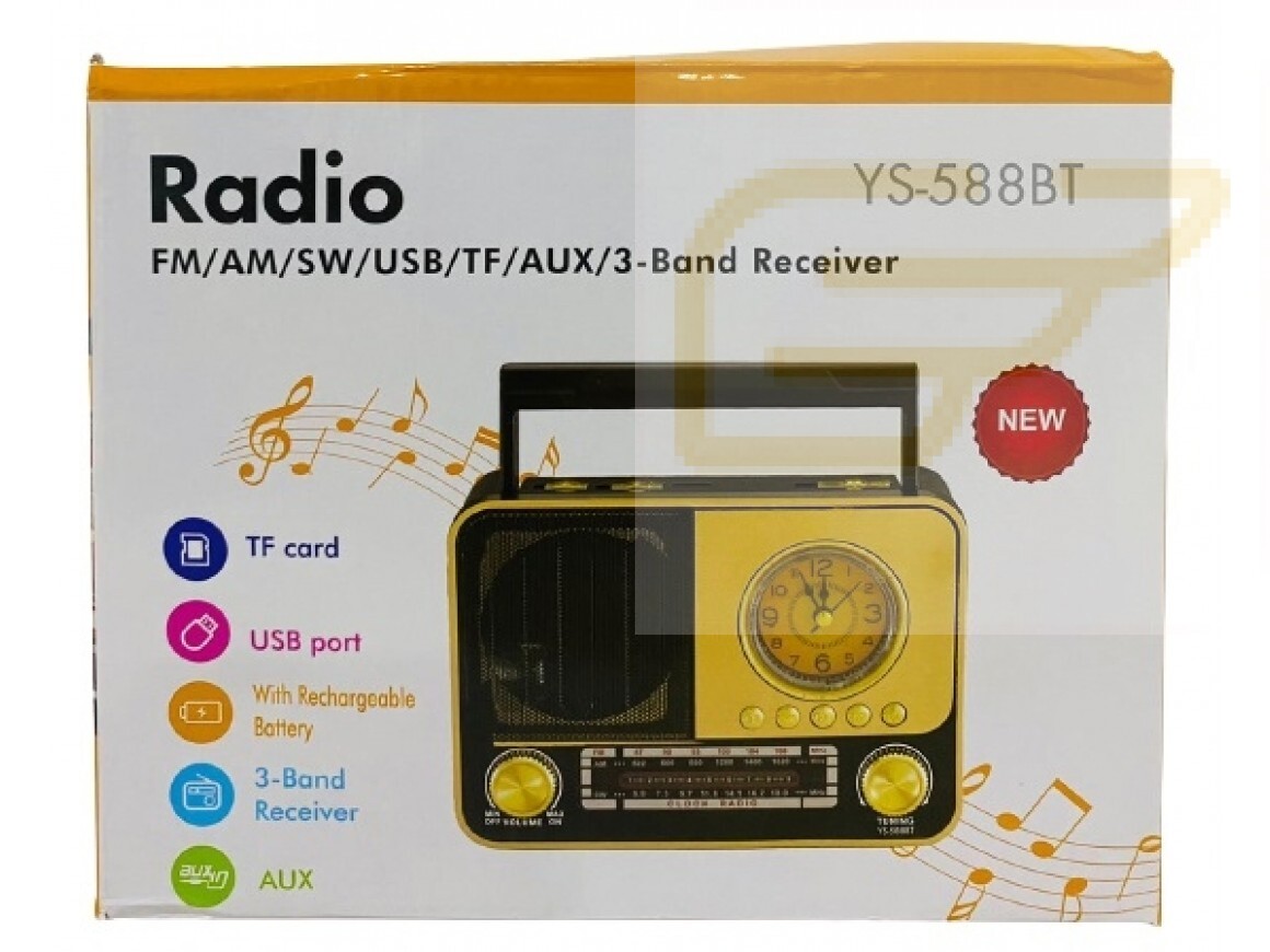 Rádio Ys588bt Este é um rádio estilo retro, com Bluetooth, entrada para Pen drive e cartão de memória. Ele é construído em matérias de alta qualidade, gerando um ótimo acabamento. Possui uma ótima captação de rádio AM/FM. Pode ser usado diretamente na tomada 110/220v, ou fora dela, com sua bateria recarregável de ótima autonomia.