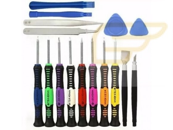 Conjunto composto por 16 peças, como chaves Torx, Philips, em Y, paletas, espátulas, pinça e estilete, indicados para realização de manutenção em aparelhos, como smartphones, tablets, notebooks e etc.